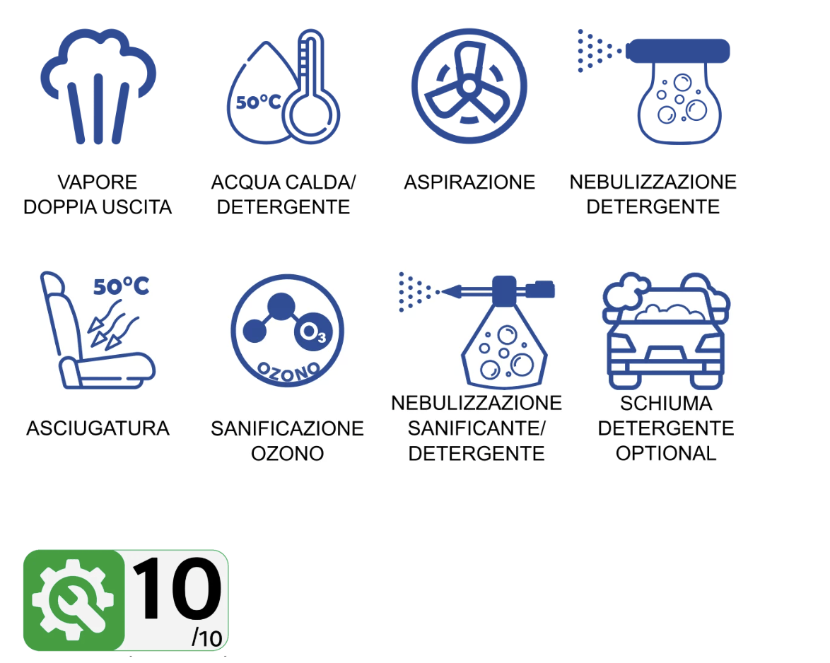 La macchina consente di pulire e sanificare sedili, impianti di aria condizionata, cielo-tetto, rivestimenti, moquette in pelle, vetri, cerchioni e motori. Raggiunge anche i punti più difficili e rimuove peli di animali e chewing-gum.