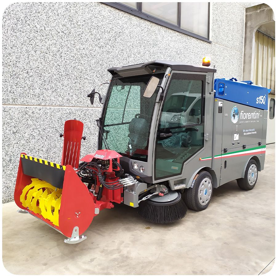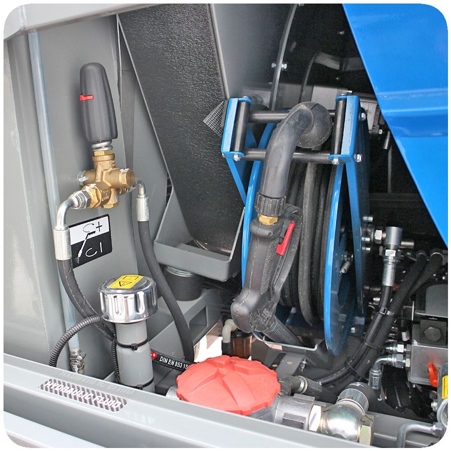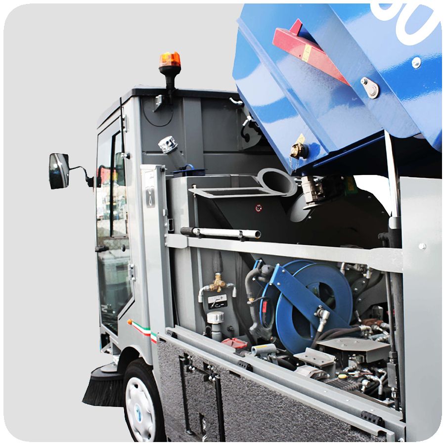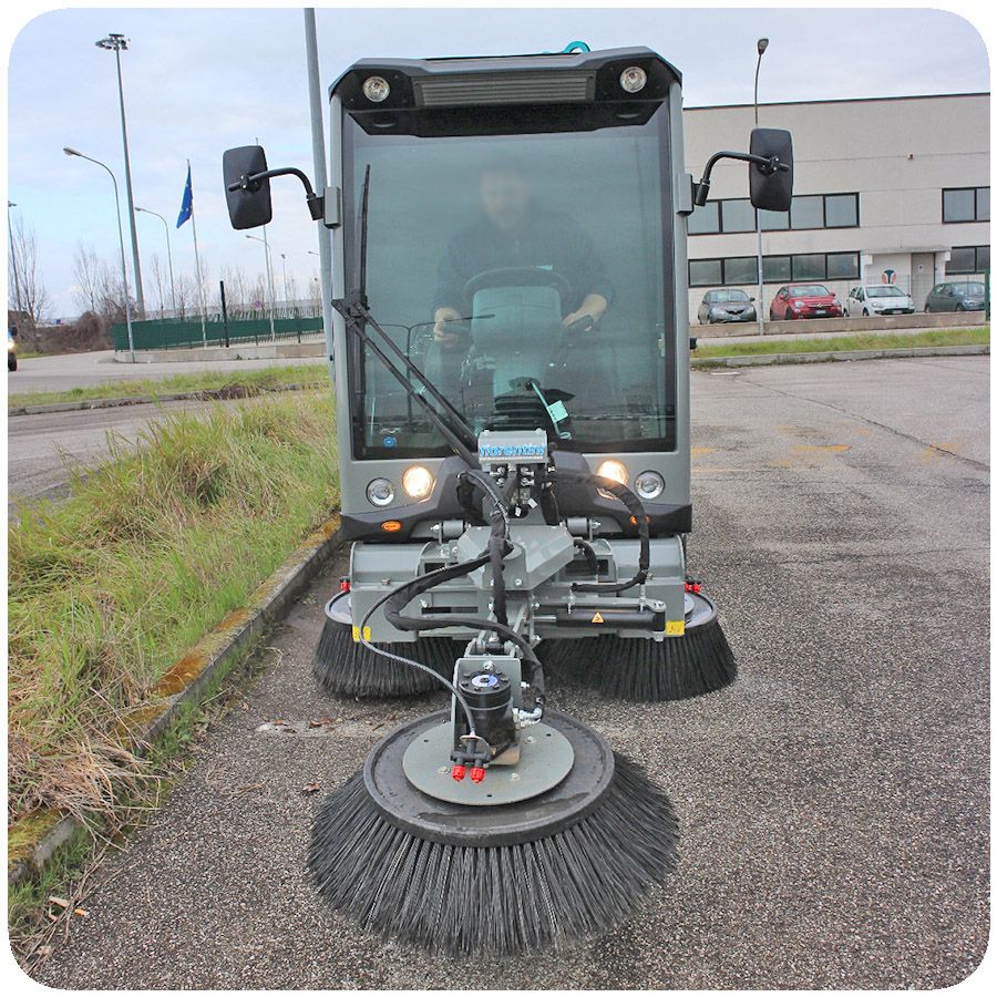 Spazzatrice stradale, molto robusta e versatile per diversi tipi di lavori, come l’aspirazione di rifiuti grazie al tubo di aspirazione, idropulitrice per pulire angoli e punti difficili da raggiungere, disponibile con 2 spazzole o anche con un terzo braccio mobile.