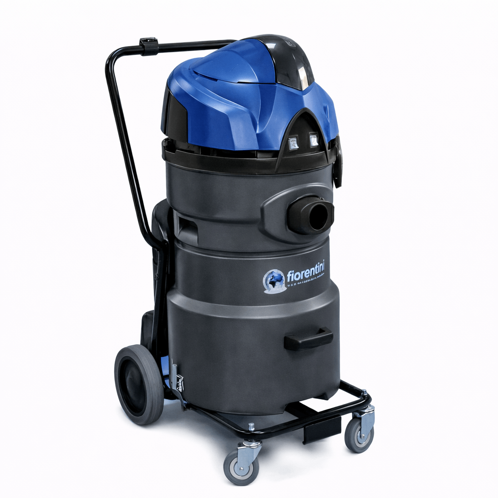 Aspirapolvere/liquidi fusto in polipropilene con filtro a cartuccia o cotone e scuotifiltro semiautomatico.